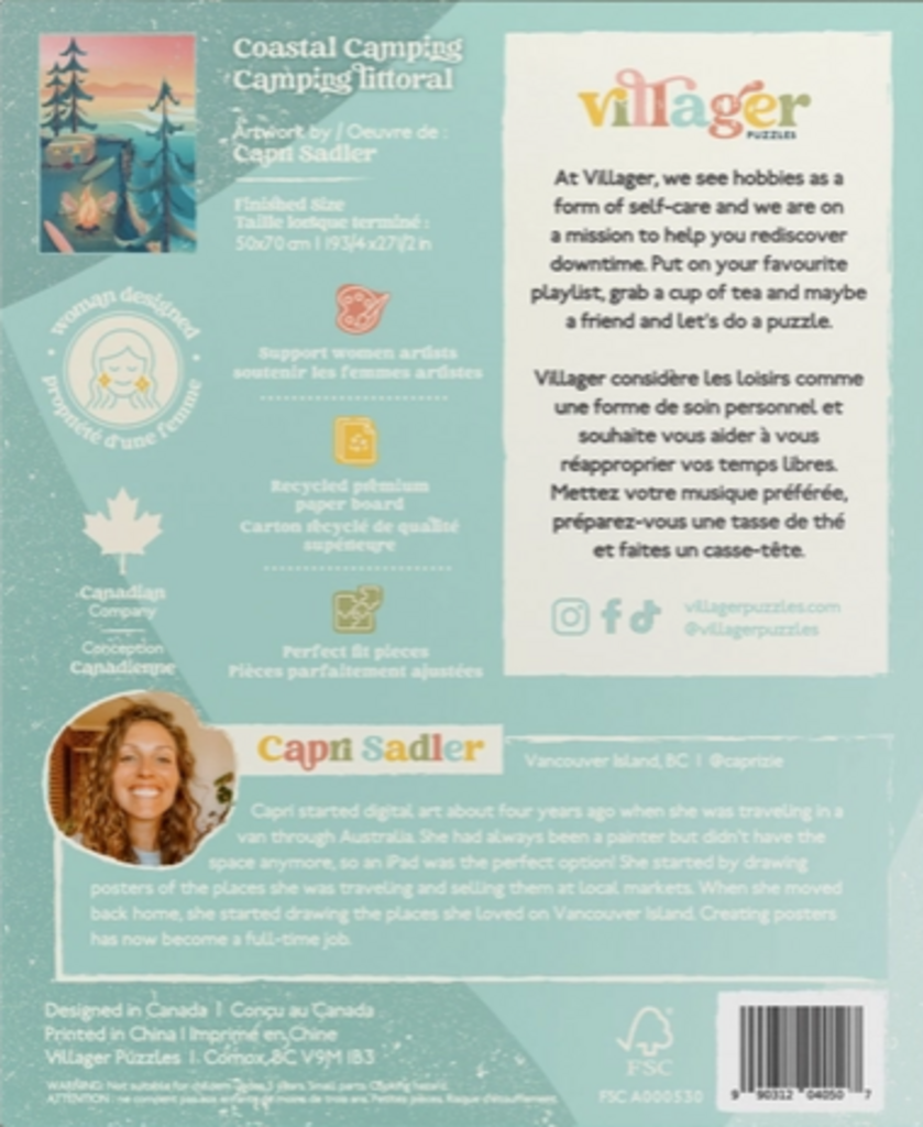 Enjoy a gorgeous pastel-coloured sunset overlooking the ocean. Beautifully-illustrated travel poster puzzle of a cozy camping trailer perched on a cliff about the peaceful ocean waves below. Designed by Vancouver Island artist Capri Sadler. Pairs with camping, coastal, nautical, ocean themed decor, prints and gifts. Style is modern and minimal. Great gift idea or souvenir for outdoor lovers.