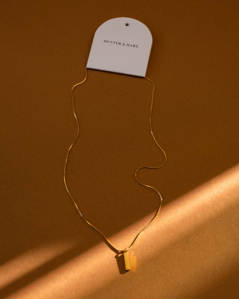 Discover the perfect balance of modern minimalism and sophisticated texture with the Reid Bar Pendant Necklace. This piece features a striking, sleek bar pendant that hangs gracefully from a fluid and polished snake chain.