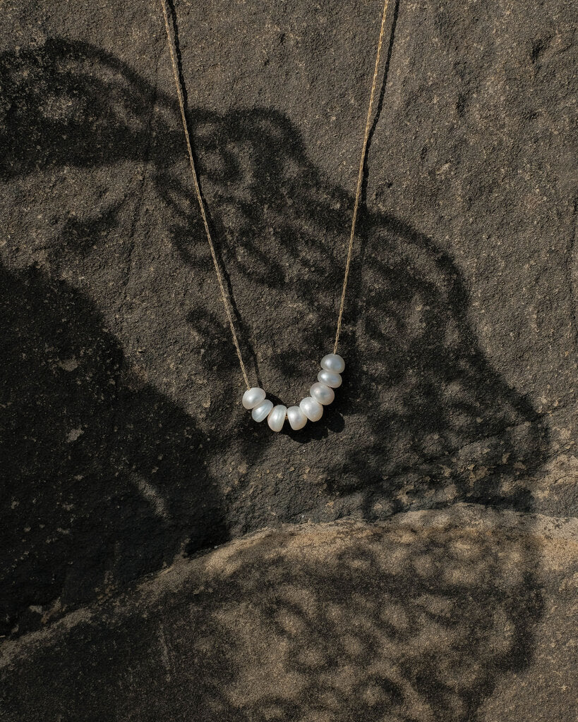 A little string of pearls on a delicate chain gives this necklaces an air of elegance without feeling overdone.